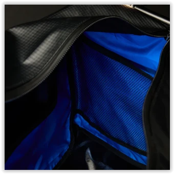 840D mit TPU-Rückseite und Pro-Tarp-Boden, blaues Innenfutter, verschweißte Nähte mit verstärkten Ecken. Übergroße Metallschnalle