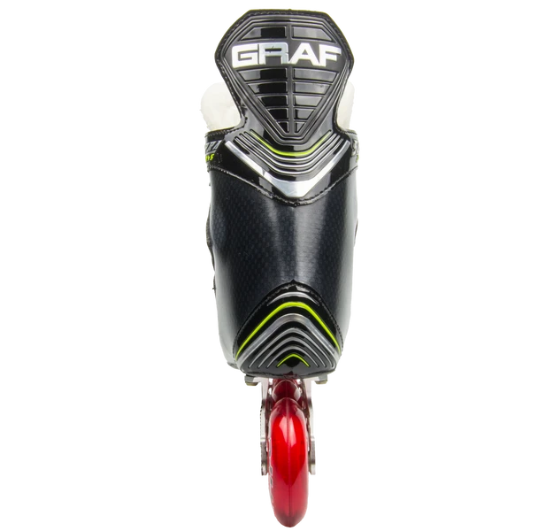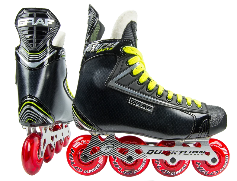 Der G6045 Inlineskate ist ein neues Modell aus dem Hause Graf und ein Skate für echte Profis und ein toller Eyecatcher. Das 3D geformte Purlyn Aussenmaterial bietet höchsten Schutz und macht den Schuh extrem robust. Das Futtermaterial Clarino sorgt für besten Comfort und hohe Stabilität. Der Knöchelbereich ist mit leichtem Memory-Schaum für perfekten Schutz ausgestattet. Die Flex Pro Zunge, 7mm Filz mit angepasster Einlage und seitlichem Composite Material sorgt für hohen Comfort und Stabilität im Schuh und verhindert das durchdrücken der Schnürsenkel. Die anatomisch geformte Rebelsfeet Sole mit Kahnbeinabstützung ermöglicht eine perfekte Kraftübertragung. Der Skate ist durch den GRAF Power-Lock anatomisch vorgeformt und „klebt“ direkt am Fuß. Zusätzlich ist der Graf G6045 Inlinehockey Skate thermoformbar und bietet somit immer einen perfekten Sitz. Die Außensohle besteht aus einer Composite Brillensohle – das Special hier ist, dass ihr den rechten und linken Schuh in verschiedenen Größen bzw. Weiten wählen könnt. Für Leute mit zwei unterschiedlichen Füßen ein echtes Benefit Das Chassis basiert auf der QuickTurn40 –Technologie –produziert mit einem 6061 T6 Aluminium aus einem Teil -Rollenanordnung: vorne kleinere Rollen sorgen für mehr Wendigkeit und die größeren Rollen hinten für absoluten Top Speed. Zusätzlich hält es den Schuh sehr leicht. Features: Chassis: OuickTurn – QT40 Weite: Regular – Wide Rollen: REVISION Clinger (80mm/80mm/76mm/76mm)74A Indoor Außenmaterial: 3D geformtes Purlyn Futtermaterial: Clarino für besten Comfort Knöchelpolster: aus leichtem Memory Schaum Zunge: Flex Pro, 7mm Filz mit angepasster Einlage und seitlichem Composite Material für hohen Comfort und Stabilität im Schuh Sehnenschutz: Surlyn (Flex Technologie aus Microfibre und Surlyn) Fußbett: Rebelsfeet, Anatomisch geformt mit Kahnbeinabstützung Thermoformbar: JA (ohne Rollen) Außensohle: Composite Brillensohle